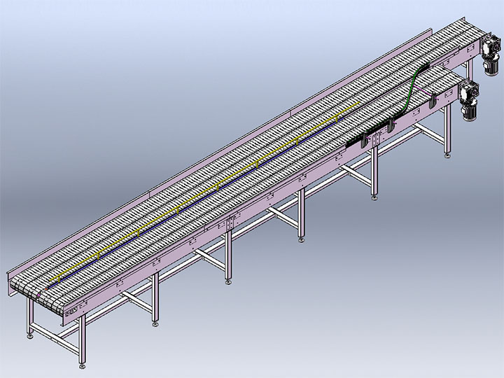 鏈板輸送機是一種以標準鏈板為承載面,由馬達減速機為動力傳動的傳送裝置。鏈板式輸送機,由動力裝置(電機)、傳動軸、滾筒、張緊裝置、鏈輪、鏈條、軸承、潤滑劑、鏈板等等構(gòu)成。其中帶動物料的輸送的主要的兩個部分為:鏈條,利用它的循環(huán)往復運動提供牽引動力;金屬板,作為輸送過程中的承載體。可以通過多列鏈板并行,使鏈板輸送機做的很寬并形成差速,利用多列鏈板的速度差使多列輸送在無擠壓的情況下變?yōu)閱瘟休斔停瑥亩鴿M足飲料貼標、灌裝、清洗等設備的單列輸送的要求,我們可以將兩條鏈板輸送機的頭尾部做成重疊式的混合鏈使得瓶(罐)體處于動態(tài)過度狀態(tài),使輸送線上不滯留物料,可以滿足空瓶以及實瓶壓力和無壓力輸送。